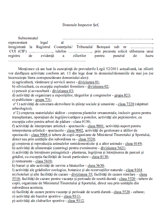 - Prezentul formular se completează pentru achiziţionarea registrului de evidenţă a zilierilor.