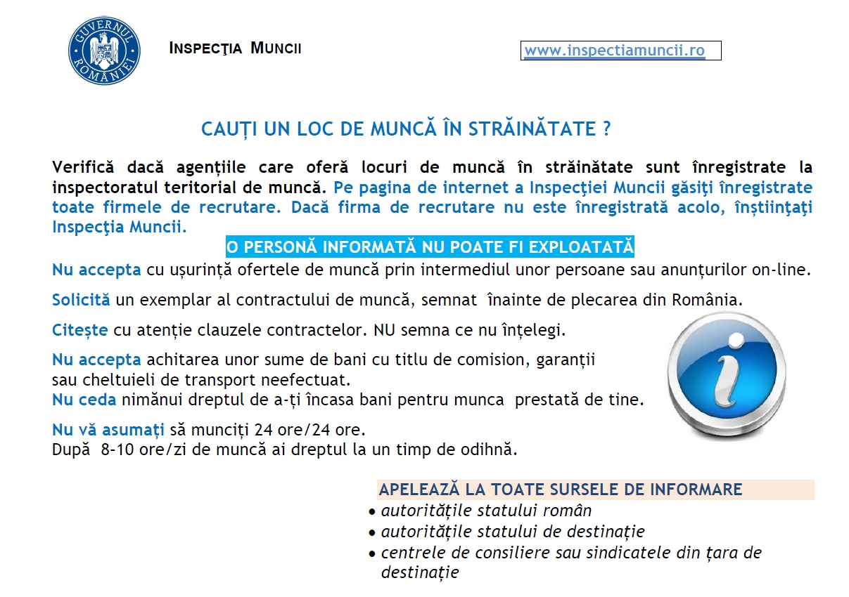 și este publicat și pe site-ul Inspecției Muncii la secțiunea NOUTĂȚI, sub titlul: ”Informații destinate cetățenilor români care intenționează să lucreze ca lucrători sezonieri în Germania”, iar la secțiunea GHIDURI de pe prima pagină, veți găsi numeroase alte materiale informative care au ca scop creșterea nivelului de informare a cetățenilor români care doresc să muncească în statele membre UE/SEE, Elveția și UK în contextul BREXIT.